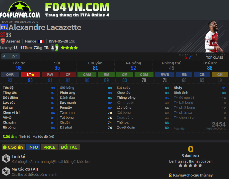 - Tốc độ : Tốc độ là một trong những điểm mạnh hàng đầu của Lacazette. Đặc biệt là với chỉ số ẩn ma tốc độ khiến những tình huống dốc bóng của anh có tốc độ cực kì tốt và rất khó bám đuổi một khi anh đã thoát xuống.