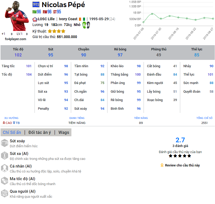 Chỉ số của Nicolas Pepe | Nguồn : FO4PLAYER.COMChấm điểm : 8,9/10