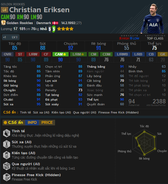 - Thăng bằng tốt : Khả năng thăng bằng của cầu thủ này là tốt, cùng với sự nhanh nhẹn trong những tình huống di chuyển khiến cho việc kiểm soát trái bóng trở nên tốt hơn và dễ dàng tạo đột biến hơn. Đặc biệt là trong một số tình huống tranh chấp trực tiếp với đối phương, bạn hoàn toàn có thể sử dụng EC để vừa che bóng vừa di chuyển và Eriksen thường ít khi bị đẩy ngã trong những tình huống như vậy.
