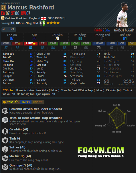 Thẻ mùa giải GR của Rashford đã cải thiện rất nhiều những điểm mạnh của cầu thủ nay sau 2 mùa giải trước đó là mùa Live và mùa TB. Hãy cùng FO4VN.COM tìm hiểu về Rashford GR nhằm giúp cho người chơi FO4 có cái nhìn toàn diện nhất về chàng cầu thủ này nhé.