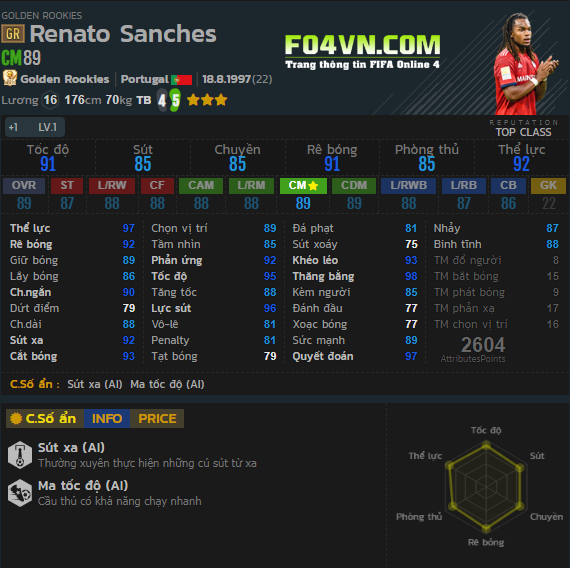 OVR 89, cùng với đó là mức lương khá thấp khi chỉ ở mức 16. Khá ổn cho một vị trí tiền vệ trung tâm. Chân không thuận của cầu thủ này là 4 sao. Cùng với đó là chỉ số ẩn sút xa và ma tốc độ.
