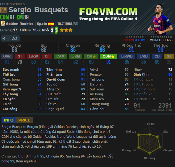 - Mức lương : Mức lương 17 là khá cao với một mẫu cầu thủ khó dùng như Busquets. Vì vậy hãy cân nhắc thật kỹ để cân bằng giá trị lương của đội hình nếu muốn đưa cầu thủ này về.