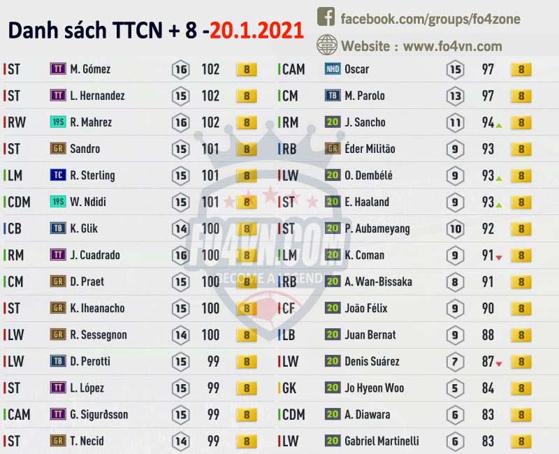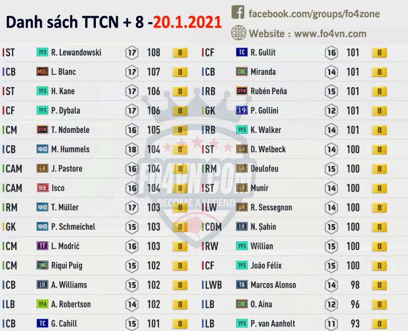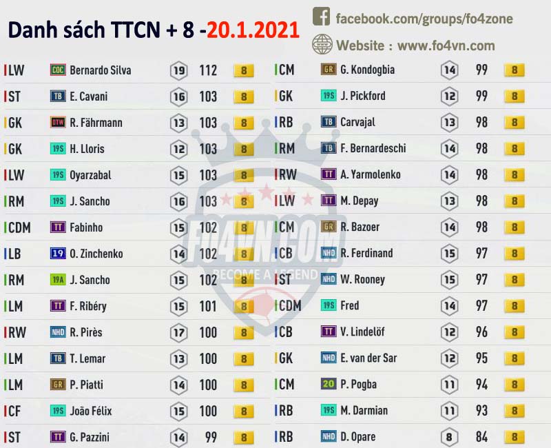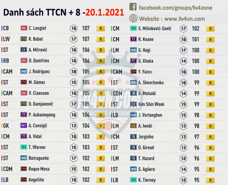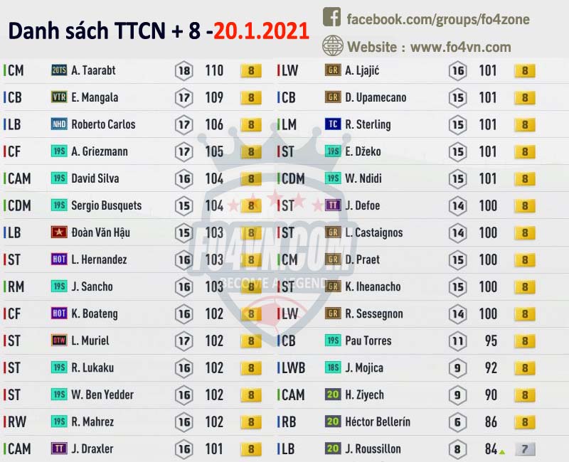 Fo4vn xin được tổng hợp tất cả những cầu thủ đang được các HLV rao bán trên group của chúng tôi ( https://www.facebook.com/groups/fo4zone ). Danh sách này sẽ được update liên tục trong ngày, hi vọng nó sẽ có thể giúp các bạn có được cầu thủ cần tìm.