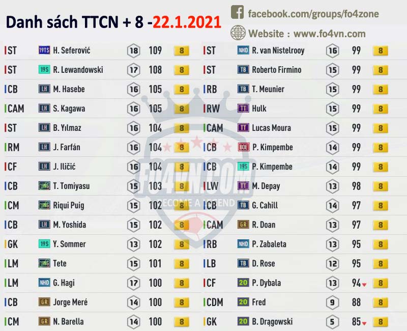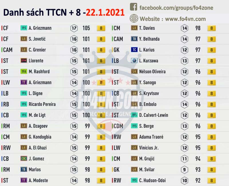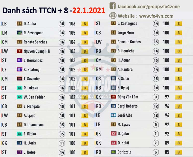 Fo4vn xin được tổng hợp tất cả những cầu thủ đang được các HLV rao bán trên group của chúng tôi ( https://www.facebook.com/groups/fo4zone ). Danh sách này sẽ được update liên tục trong ngày, hi vọng nó sẽ có thể giúp các bạn có được cầu thủ cần tìm.
