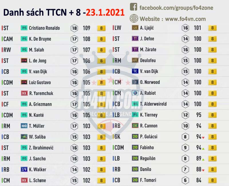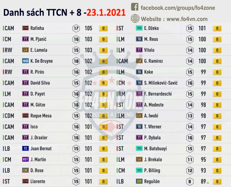 Fo4vn xin được tổng hợp tất cả những cầu thủ đang được các HLV rao bán trên group của chúng tôi ( https://www.facebook.com/groups/fo4zone ). Danh sách này sẽ được update liên tục trong ngày, hi vọng nó sẽ có thể giúp các bạn có được cầu thủ cần tìm.