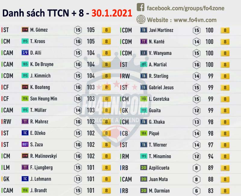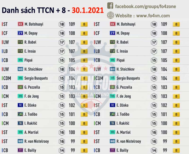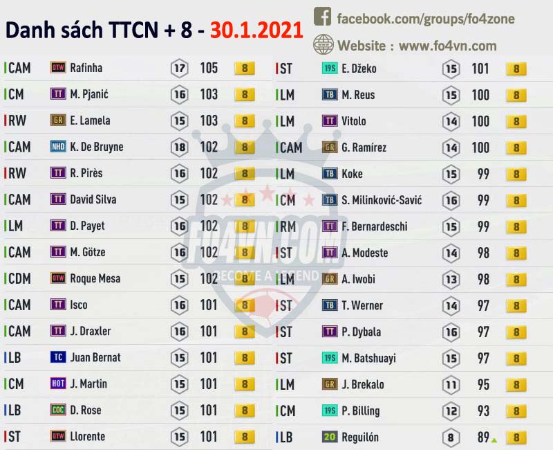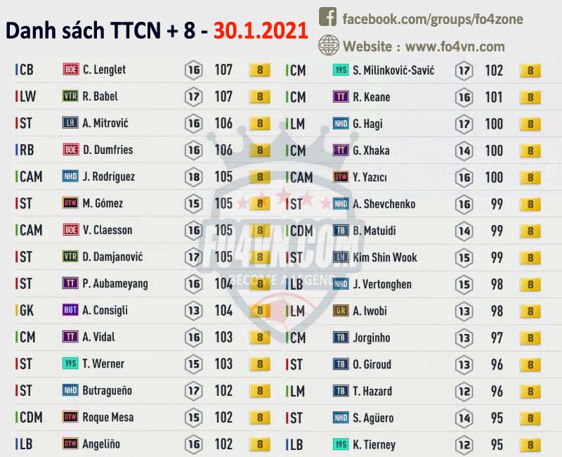 Fo4vn xin được tổng hợp tất cả những cầu thủ đang được các HLV rao bán trên group của chúng tôi ( https://www.facebook.com/groups/fo4zone ). Danh sách này sẽ được update liên tục trong ngày, hi vọng nó sẽ có thể giúp các bạn có được cầu thủ cần tìm.
