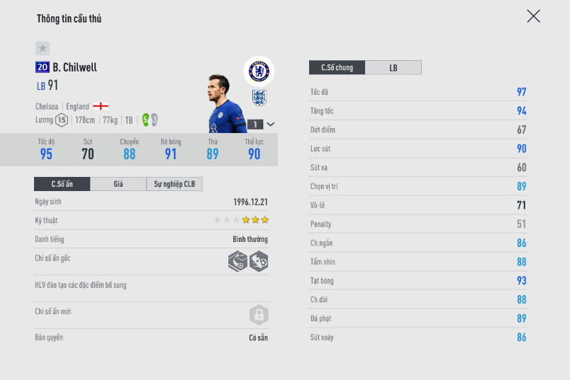 Sự lựa chọn cực kì đáng tin cậy nơi hành lang trái của ĐT Chelsea thời điểm hiện tại. Lối chơi chắc chắn, tốc độ tốt, khả năng phòng ngự tuyệt vời vả cực kì ổn định. Ngoài ra, khả năng duy trì thể lực của Chilwell cũng là rất ổn. Anh có thể thi đấu cả trận mà vẫn duy trì được phong độ ở mức ổn.