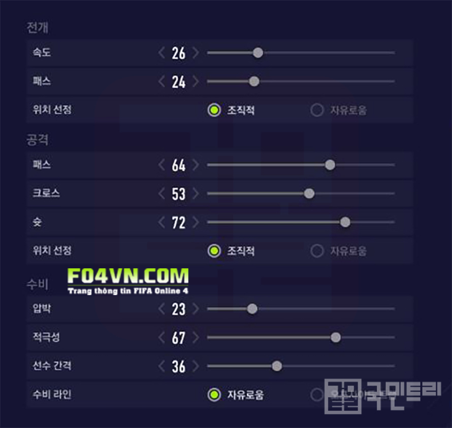 Tổng quát : Tốc độ 26, chuyền 24 giúp các vị trí trên sân chơi bó hẹp, tốc độ chậm khiến các cầu thủ chỉ ke bóng và vào lấy bóng khi thật sự chắc chắn, Xu hướng chơi tổ chức để các cầu thủ duy trì tốt vị trí thi đấu trên sân.