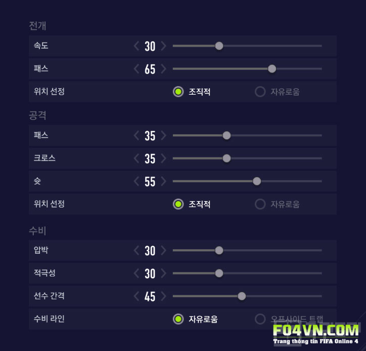 Tổng quát: tốc độ ở mức 30 để những pha di chuyển chậm rãi vừa đủ,không quá nhanh, không quá dồn dập, thích hợp cho người chơi xu hướng kiểm soát bóng. Chuyền 65 để giữ khoảng cách giữa các cầu thủ ở mức trung bình và tốc độ chuyền bóng ở mức ổn định.