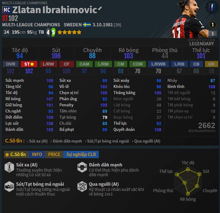 Cao lớn, dũng mãnh, có thể đè ngửa mọi hậu vệ, và đặc biệt là những mùa giải gần đây Ibra được buff tốc độ và khả năng không chiến tuyệt vời. Bạn cần gì ở một tiền đạo nữa ? Một khi Ibra đã chạy trước thì quá khó cho hậu vệ đối phương có thể cướp được bóng. Kỹ năng dứt điểm toàn diện. Bất cứ lúc nào bạn cũng có thể có tung ra một cú sút từ ngoài vòng cấm để làm nên một siêu phẩm