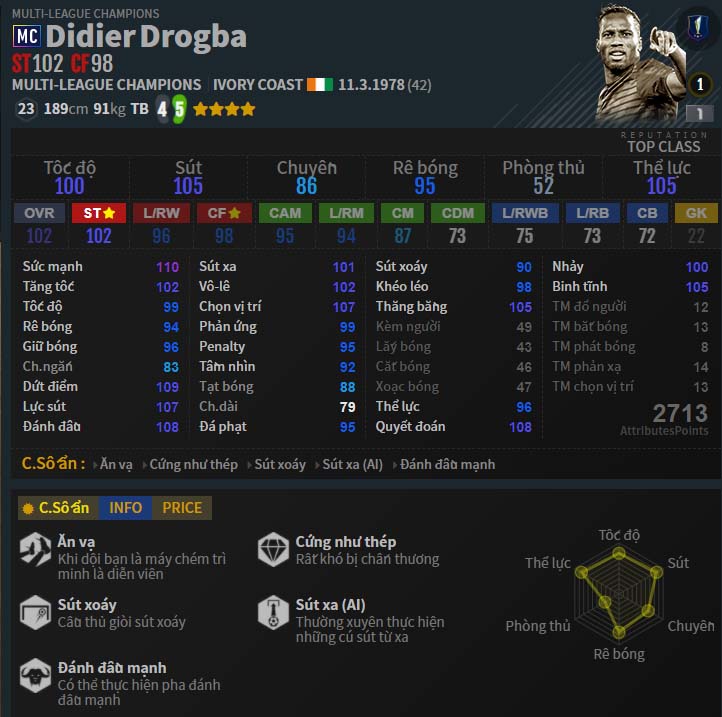 Một cái tên đã là thương hiệu cho tựa game FIFA Online. Không mạnh trong di chuyển không bóng. Nhưng không chiến và làm tường thì Drogba có thừa. Bất cứ ai trong số những người chơi FIFA đều một lần dùng qua hoặc đối đầu với voi rừng. Sức càn lướt và phá hoại hàng thủ đối phương là điều không phải bàn cãi. Dù không nhanh, nhưng sức vóc kéo lại cho anh rất nhiều.