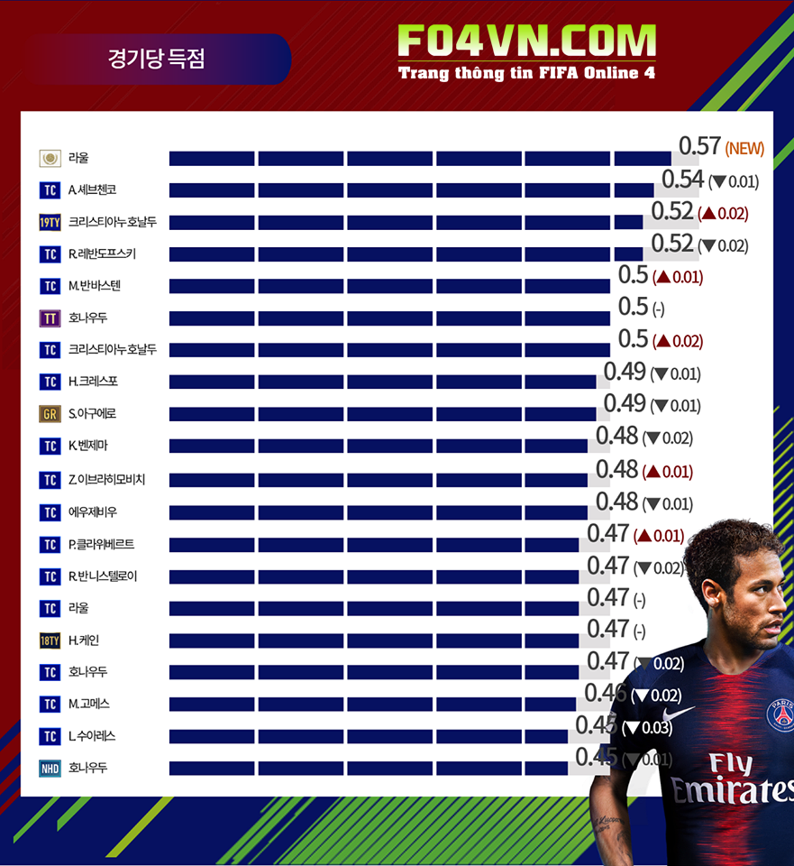 Ngày 12 tháng 6 vừa qua, FIFA Online 4 Server Hàn Quốc đã đăng tải danh sách mới nhất về top 20 cầu thủ giai đoạn nửa đầu tháng 6. Trong đó Top 20 cầu thủ dứt điểm khét nhất đã có nhiều những sự thay đổi về thứ hạng cũng như thêm 1,2 cái tên mới. Vậy những sự thay đổi đó là gì?