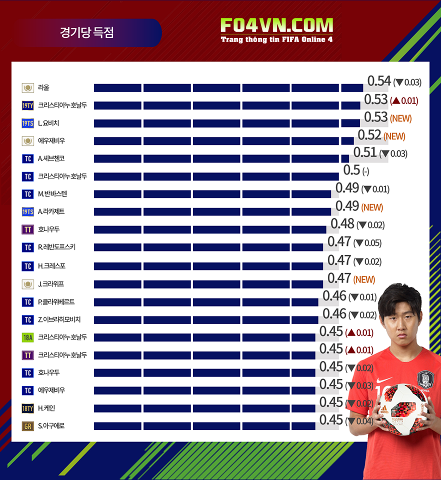 Ngày 3 tháng 7 vừa qua, FIFA Online 4 Server Hàn Quốc đã đăng tải danh sách mới nhất về top 20 cầu thủ giai đoạn nửa đầu tháng 7. Trong đó Top 20 cầu thủ dứt điểm khét nhất đã có nhiều những sự thay đổi về thứ hạng cũng như thêm 1,2 cái tên mới. Đặc biệt là sự có mặt của mùa giải 19TS . Vậy những sự thay đổi đó là gì?
