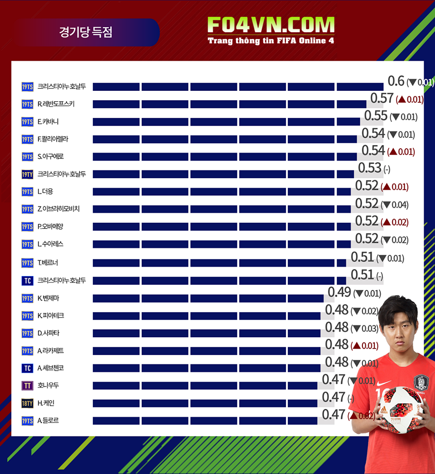 Hôm nay ngày 1/8/2019. Trang fanpage của FIFA Online 4 server Hàn Quốc tiếp tục đăng tải danh sách những cầu thủ nằm trong top 20 của từng vị trí khác nhau. Và danh sách đầu tiên mà FO4VN.COM chia sẻ trong ngày đầu tháng 8 là danh sách top 20 những cầu thủ dứt điểm khét nhất. Sau khi thống kê lại tỉ lệ top 20 dứt điểm thì danh sách top 20 cầu thủ dứt điểm khét nhất thời gian vừa qua có một chút thay đổi nhẹ. Tuy vậy, mùa giải 19TS vẫn xâm chiếm hầu hết bảng xếp hạng dứt điểm với những cái tên đã quen thuộc từ bxh trước. Đặc biệt hơn, Raul ICON còn bị đánh bật khỏi danh sách khi có tỉ lệ dứt điểm thấp hơn so với những cái tên nằm trong top 20.