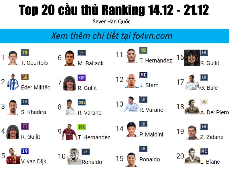 * Các hậu vệ như Maldini LH tụt từ 5 -->14, Varane LH từ 6 --> 13, Luiz LH và Vieira LH thì bay khỏi top