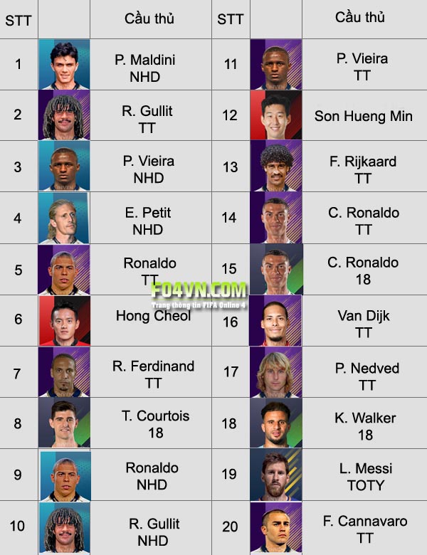 Bên cạnh đó những cái tên như K. walker 18, Cr7 18 và Son Hueng Min, Van Dijk TT bị "out".