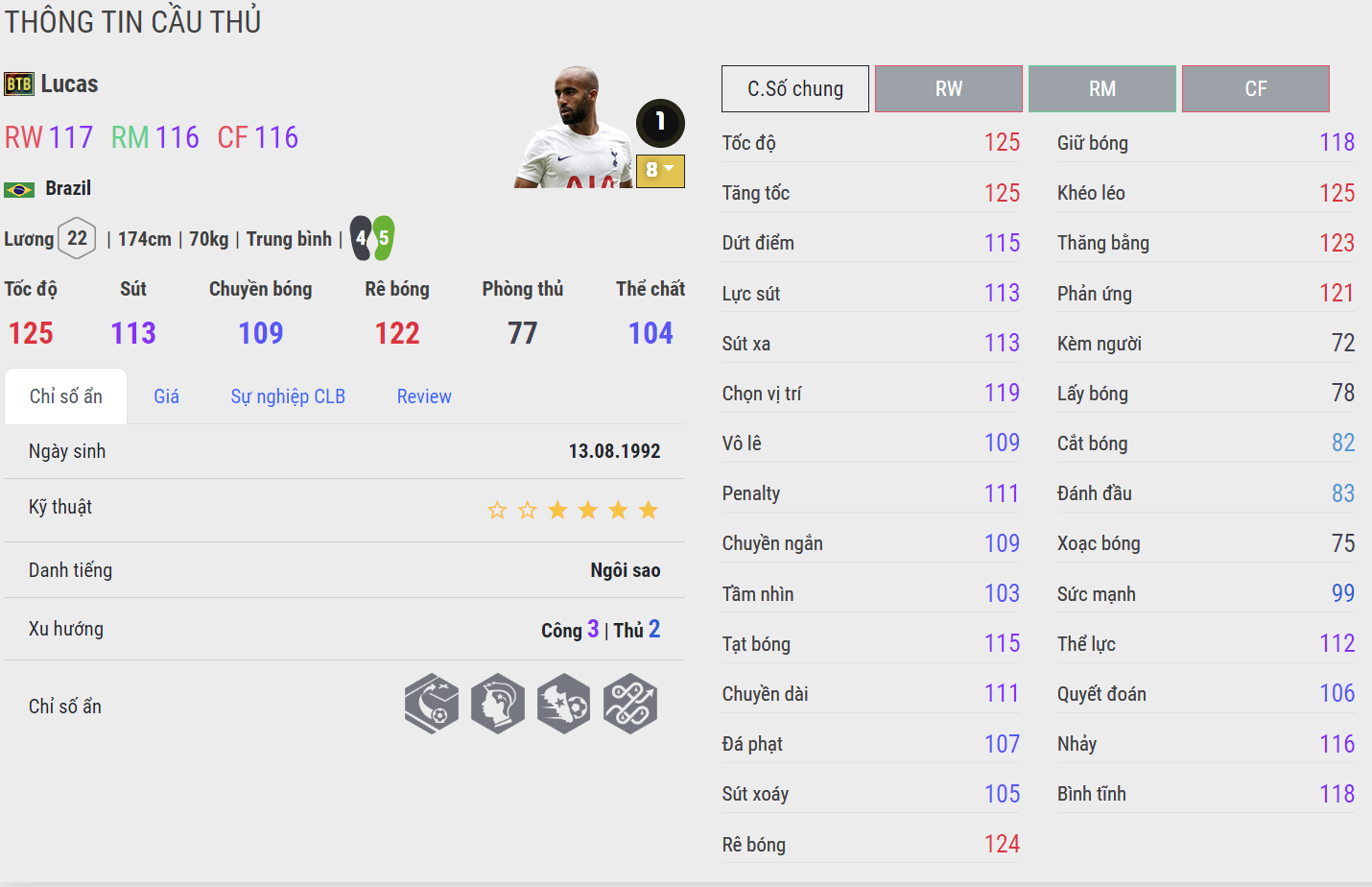 Cầu thủ chạy cánh Brazil được đánh giá rất cao cho vị trí chạy cánh của FC Online thời điểm hiện tại khi có cho mình tốc độ rất nhanh, khả năng tạt bóng tốt và kỹ năng rê bóng cực dẻo không thua kém bất kì cái tên nào. Lucas có khả năng đá tốt cả 2 chân dù cho chân trái chỉ 4 điểm, điều này khiến giá trị sử dụng của cầu thủ người Brazil tăng đáng kể.