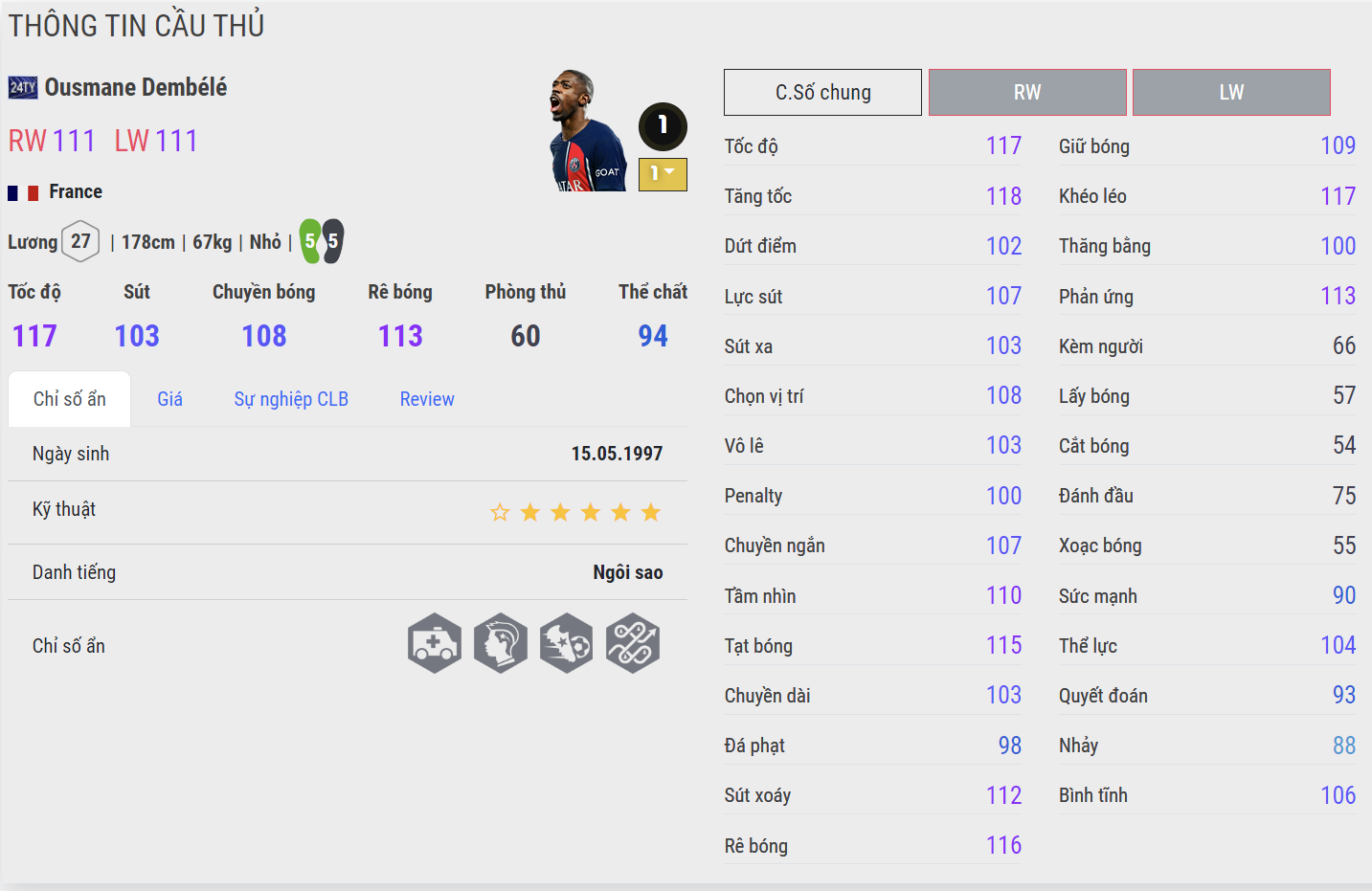 Tiền đạo cánh thuộc biên chế PSG là cái tên đầu tiên trong danh sách này. Tốc độ tốt, khả năng rê dắt cực kì dẻo là những điểm nổi bật của Dembele. Không những thế, kỹ năng chuyền bóng, đặc biệt là tạt bóng của Dembele là rất ổn với độ chính xác và độ xoáy rất tốt. Tuy nhiên, khả năng dứt điểm của Dembele chưa thực sự ấn tượng và vẫn cho cảm giác hơi thiếu ổn định.