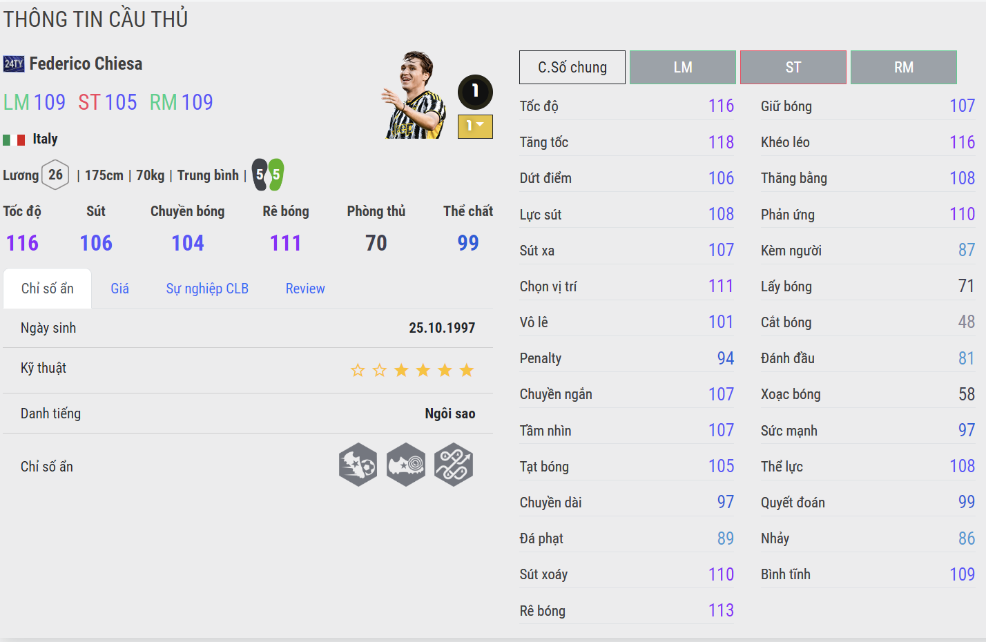 Là tài năng được kì vọng của bóng đá Ý, Chiesa cho thấy rõ sự hiện quả trong các tình huống đua tốc ở hành lang cánh. Không chỉ có tốc độ tốt, AI di chuyển của Chiesa cũng là rất hay. Sở hữu 2 chân 5-5 cùng bộ kỹ năng sút bóng và chuyền bóng đều cực kì hiệu quả. Anh tiếp tục được xem là chân chạy cánh quốc dân trong thời gian tới sau khi 2 mùa thẻ FC và HG rất thành công của mình.