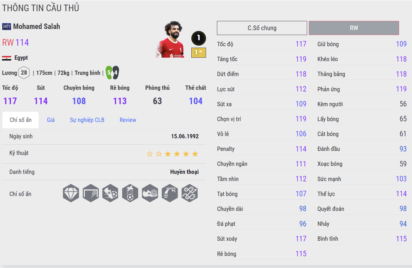 Salah là một trong những cái tên đang hot trở lại mùa 24TY, phong độ rất ổn định tại Liverpool khiến nhiều HLV giành sự quan tâm cho cầu thủ người ai cập ở mùa thẻ này. Tốc độ và kỹ thuật là 2 điều đầu tiên mà các HLV có thể thấy rõ ở Salah. Khả năng chuyền bóng tốt, tạt bóng ở mức ổn với chân không thuận, điểm mạnh ở Salah nằm ở khả năng sút xa và ZD cực kì chính xác. Không những thế Salah xâm nhập vòng cấm rất hay và luôn sẵn sàng trong các tình huống cần ghi bàn.