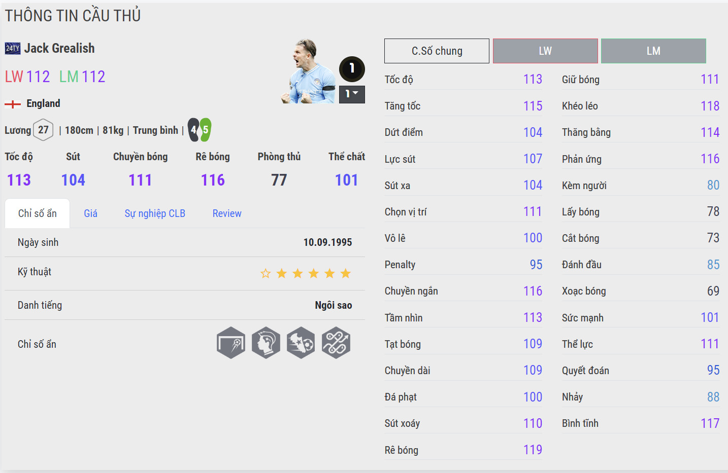 Cầu thủ chạy cánh của Man City được đánh giá rất cao ở tốc độ, khả năng xử lý bóng rất dẻo, kỹ năng rê dắt xoay sở tốt và bộ chỉ số hỗ trợ tấn công cực ổn. Khả năng chuyền ngắn, chuyền dài, phối hợp bóng hay tạt bóng của Grealish đều rất tốt. Không những vậy, kỹ năng sút bóng của Grealish là rất tốt đặc biệt là khả năng ZD cực xoáy và hiệu quả.