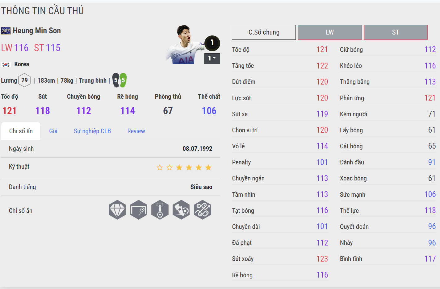 Không cần phải miêu tả quá nhiều khi "gà cưng" của Nexon luôn là cầu thủ đáng dùng ở hầu hết các mùa thẻ mà nhà phát hành ra mắt. Son Heung Min có sự toàn diện ở hành lang cánh từ tốc độ, kỹ thuật, kỹ năng chuyền bóng và khả năng ghi bàn cực kì bá đạo. Không những thế, thứ khiến Son Heung Min trở nên đặc biệt chính là ở AI di chuyển cực kì thông minh giúp anh luôn có mặt ở những điểm nóng trên sân để tham gia vào các tình huống tấn công.