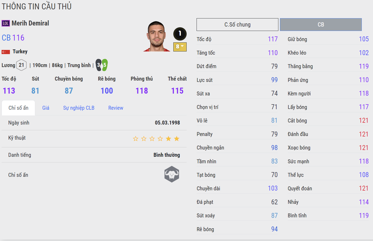Có cho mình team color Juventus, Demiral hiện đang rất được quan tâm ở mùa thẻ LOL +8. Thể hình cao to, không chiến tốt, tốc độ ổn và bộ kỹ năng phòng ngự rất hiệu quả khiến Demiral trở thành một trung vệ có giá trị sử dụng cao. Sức mạnh và khả năng thăng bằng ấn tượng giúp anh thường xuyên giành lợi thế khi so vai với đối thủ và khả năng đánh chặn tốt cùng AI khá thông minh khiến cho nhiều HLV đánh giá cao cầu thủ người Thổ Nhĩ Kỳ.
