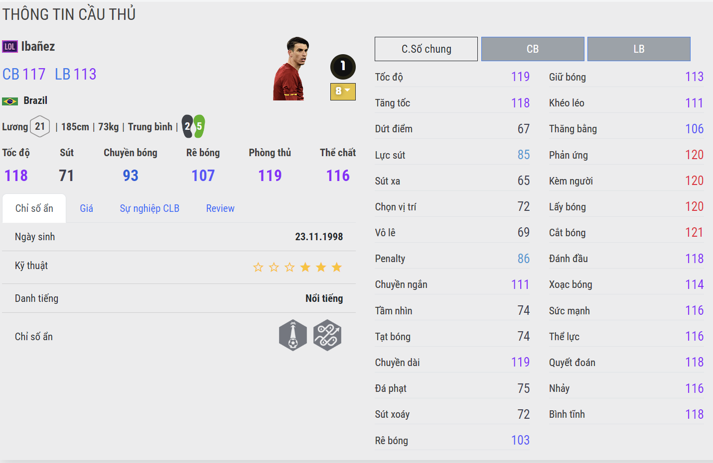 Trung vệ người Brazil đang được xem là cái tên đáng dùng cho team color Roma và ĐT Brazil. Ibanez có tốc độ tốt, thể hình cao to, sải chân dài và kỹ năng phòng ngự như không chiến, đánh chặn, cắt bóng cho đến AI di chuyển theo kèm cũng đều rất ổn. Ở mức thẻ cộng 8, Ibanez phát huy được rất nhiều khả năng cho vai trò phòng ngự và đang dần cho thấy giá trị sử dụng cực cao của mình.