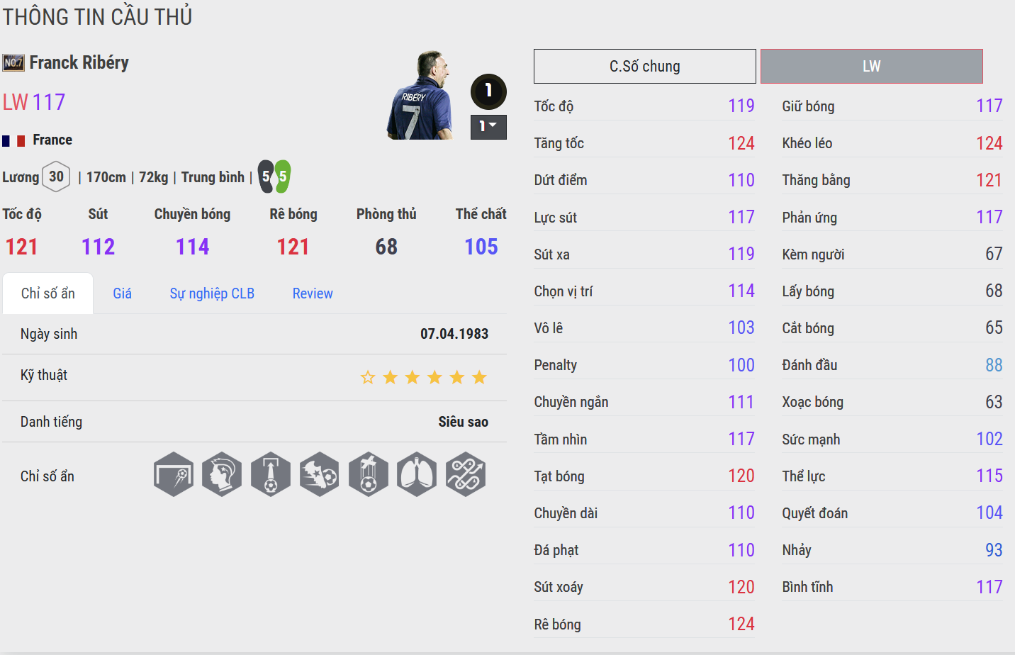 Tốc độ, lắt léo và khả năng bứt tốc cự ly ngắn tuyệt vời, Ribéry NO.7 là cơn ác mộng cho mọi hàng phòng ngự. Đây là một trong những winger được tin dùng nhất nhờ bộ chỉ số rê bóng, thăng bằng và kỹ năng 5 sao.
