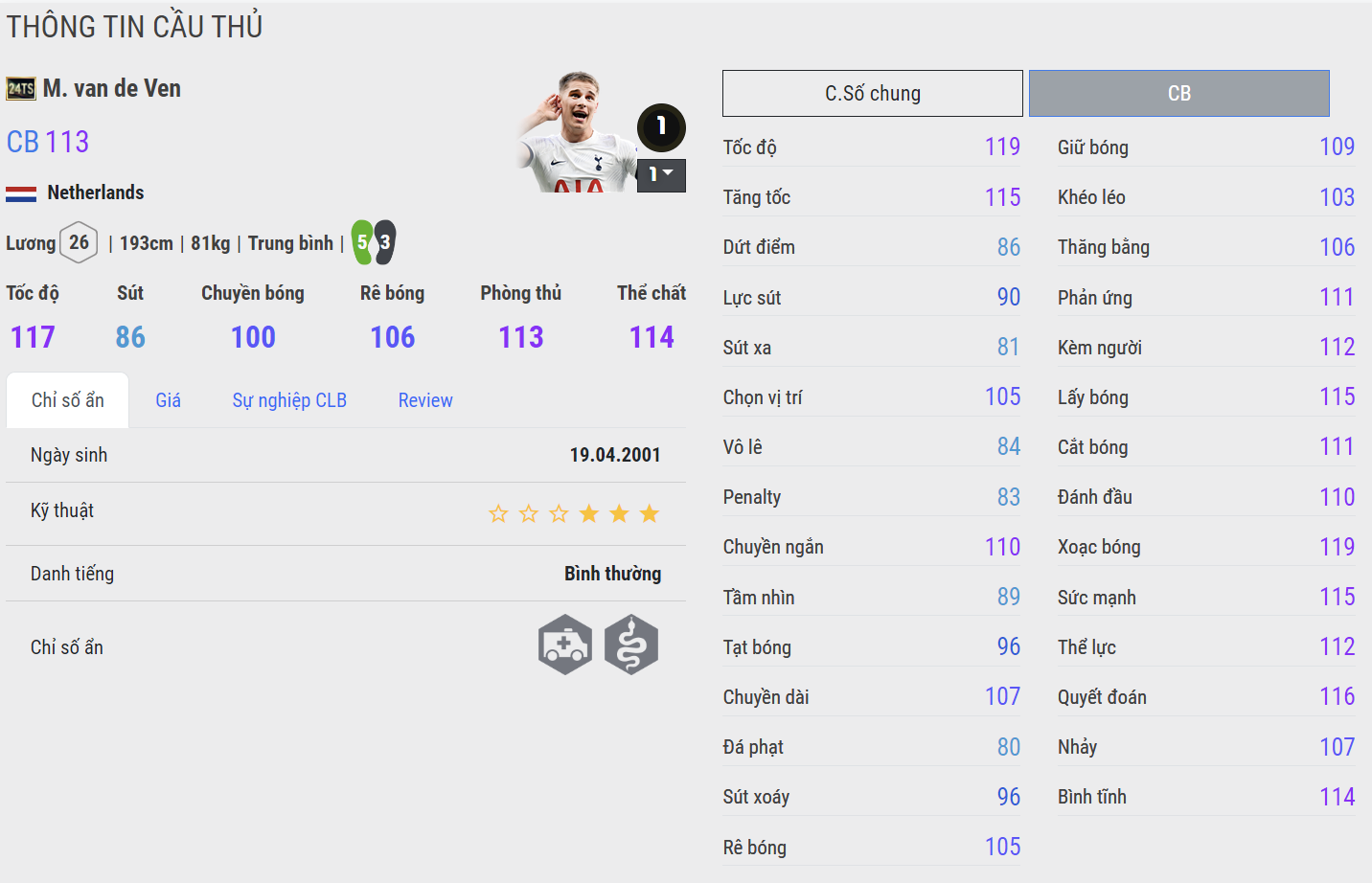 Van de Ven đang nổi lên như một hiện tượng phòng ngự mới với mùa thẻ 24TS. Anh sở hữu thể hình tốt, tốc độ nhanh, và khả năng phòng ngự linh hoạt, khiến anh trở thành lựa chọn đáng tin cậy ở vị trí trung vệ. Trong meta hiện tại, tốc độ của Van de Ven giúp anh dễ dàng thắng các pha đua tốc và áp sát đối phương một cách nhanh chóng, chính xác.