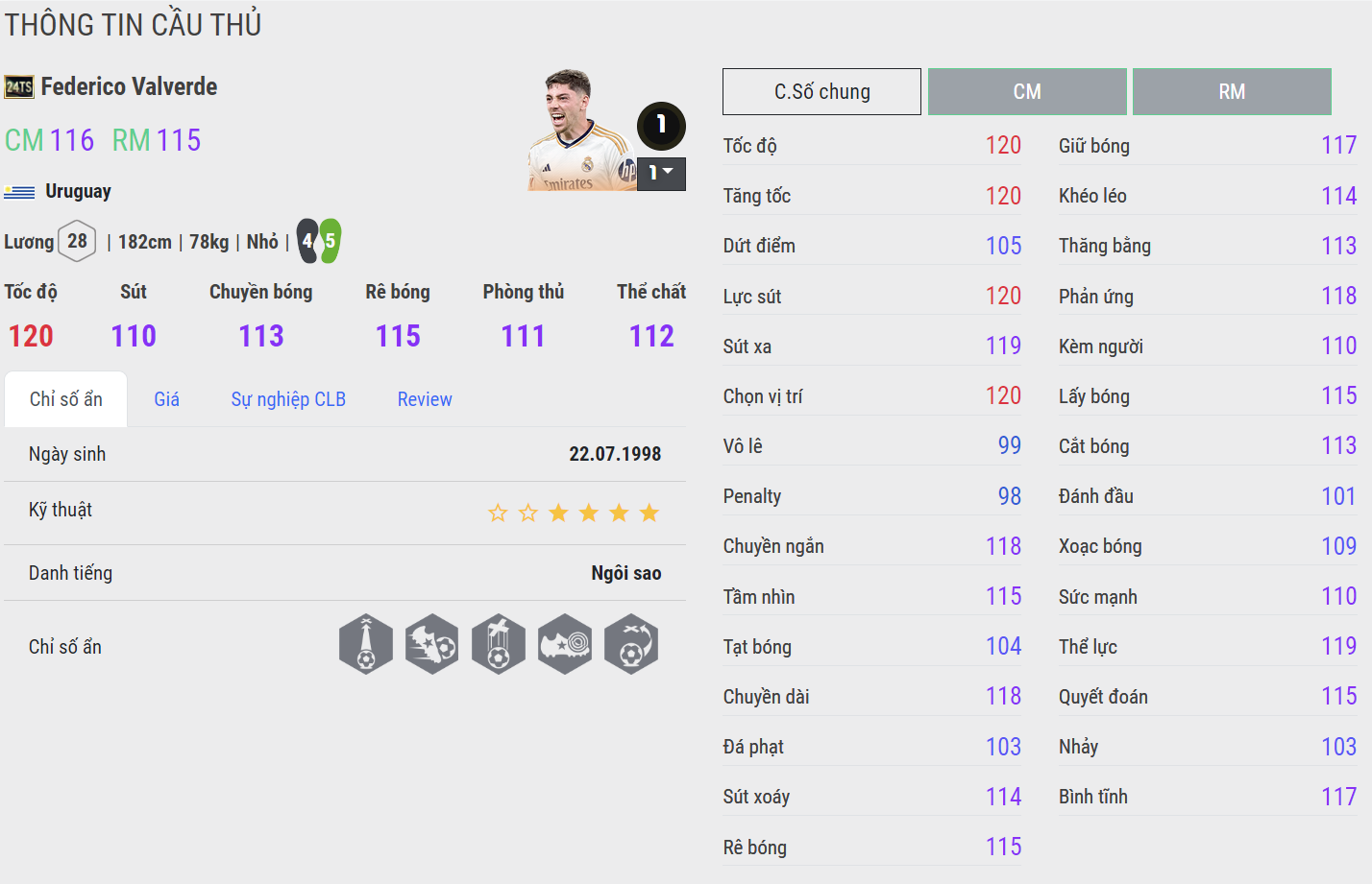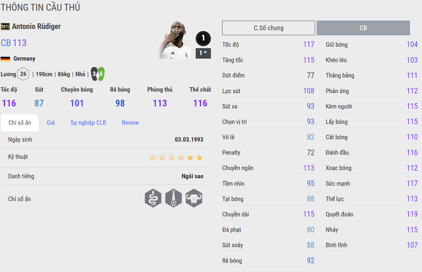Được đánh giá là trung vệ có hiệu quả thi đấu tốt nhất tháng 7 trong FC Online, không có gì ngạc nhiên khi mùa thẻ 24TS tiếp tục là một phiên bản chất lượng của Rudiger. Cầu thủ người Đức sở hữu tốc độ, sức mạnh, thể hình lý tưởng, cùng khả năng phòng ngự linh hoạt và hiệu quả. Hơn nữa, Rudiger còn được hỗ trợ bởi hai team color hàng đầu là Chelsea và Real Madrid.