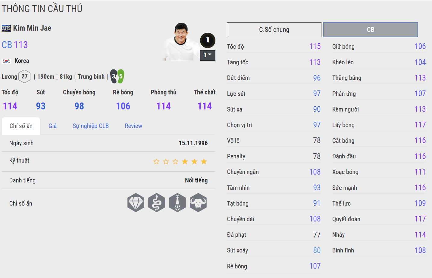 Trung vệ Hàn Quốc được đánh giá rất cao ở vai trò phòng ngự mùa thẻ 23TS. Sở hữu khả năng phòng ngự ấn tượng, tốc độ ổn cùng thể hình to cao giúp cho anh giành được nhiều lợi thế ở những tình huống tranh chấp tì đè tay đôi. Không chiến tốt và khả năng tắc bóng của Kim Min Jae rất hiệu quả. Cùng với đó việc sở hữu team color Bayern giúp anh gần như là cái tên không thể thay thế.