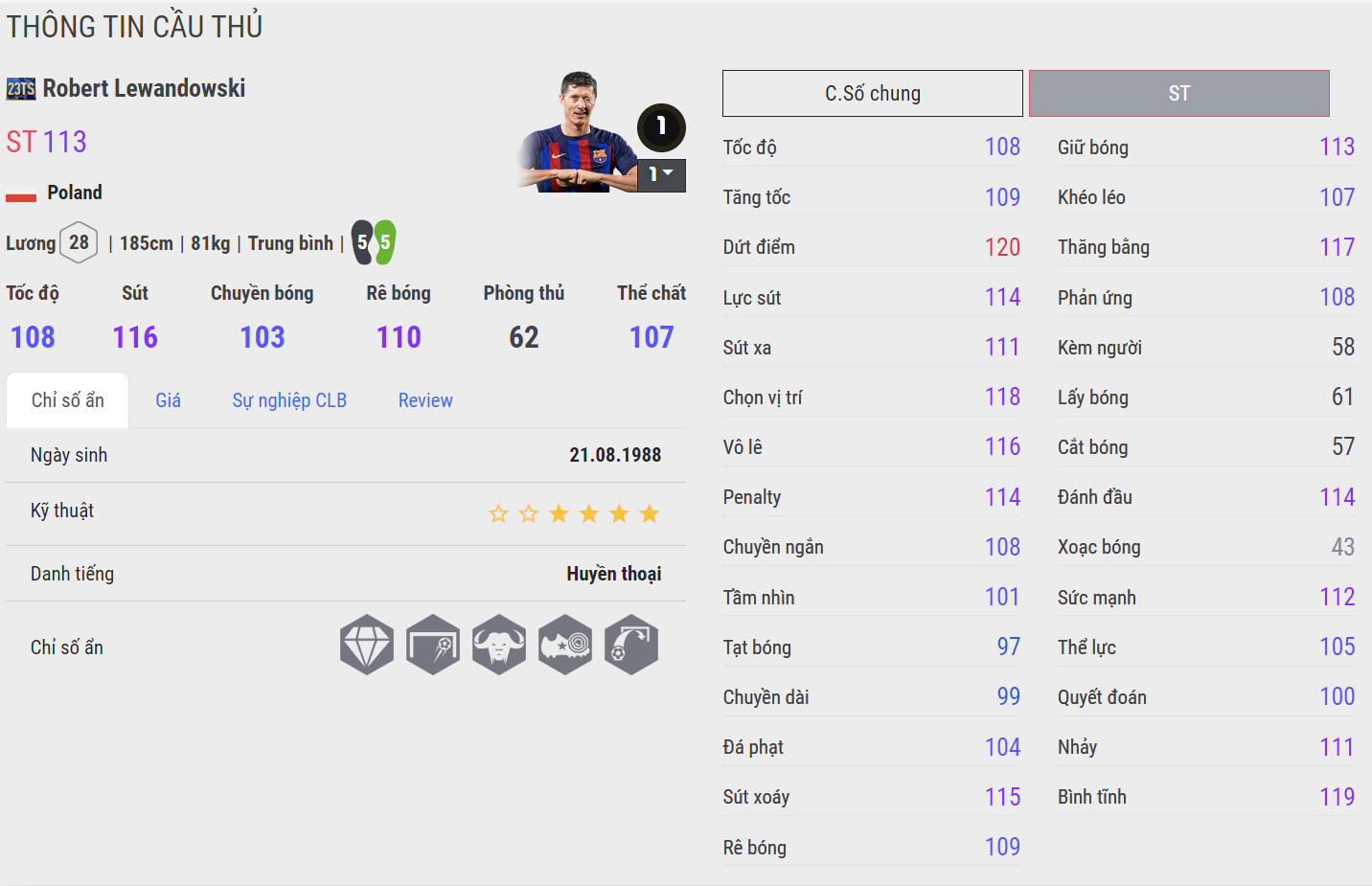 Lewandowski mùa 23TS vẫn được đánh giá rất cao và là một trong những cây săn bàn hàng đầu FC Online. Không phải ngẫu nhiên mà Lewandowski luôn nằm trong danh sách top đầu về tỉ lệ săn bàn của FC Online. Sở hữu 2 chân 5 sao, kỹ năng dứt điểm toàn diện cùng khả năng không chiến xuất sắc. Lewandowski có những team color hàng đầu như Bayern, Barca hay Dortmund.
