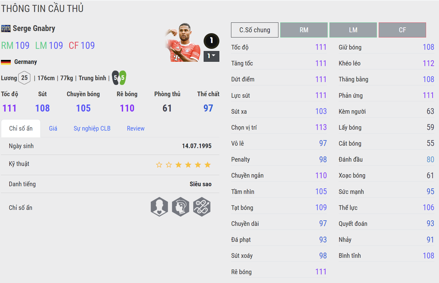 Gnabry luôn được coi là một chân chạy cánh hàng đầu game thời điểm hiện tại. Sở hữu 2 chân 5 sao, tốc độ rất tốt, kỹ năng dứt điểm và rê dắt hiệu quả cùng với đó là bộ chỉ số chuyền bóng ấn tượng và cho thấy sự uy tín trong game. Sở hữu những team color hàng đầu như Arsenal, Bayern Munich, ĐT Đức.
