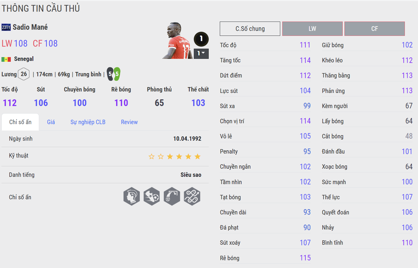 Mane 23TY vẫn được đánh giá là mùa thẻ chất lượng và đáng dùng hàng đầu thời điểm hiện tại. Sở hữu team color chất lượng như Liverpool hay Bayern Munich, Mane là mẫu cầu thủ chạy cánh tốc độ, khả năng rê dắt tốt và kỹ năng săn bàn ổn định. Đặc biệt, phiên bản 23TY có 2 chân 5 sao cùng với khả năng thi đấu đa dạng vị trí từ hành lang cánh, hộ công hay thậm chí là tiền đạo cắm.