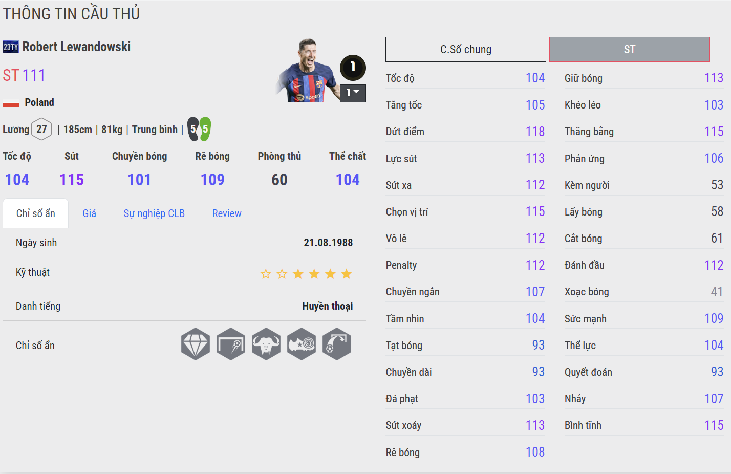Lewy phiên bản 23TY vẫn được coi là một cây săn bàn hàng đầu. Anh là mẫu tiền đạo số 9 điển hình của FC Online khi sở hữu tốc độ ổn ,kỹ năng dứt điểm toàn diện bằng cả 2 chân từ sút xa, sút xoáy cho đến dứt điểm vòng cấm. Khả năng không chiến của Lewandowski cũng là rất xuất sắc và hiệu quả. Lewy gần như toàn diện với mọi yêu cầu ghi bàn của các HLV.