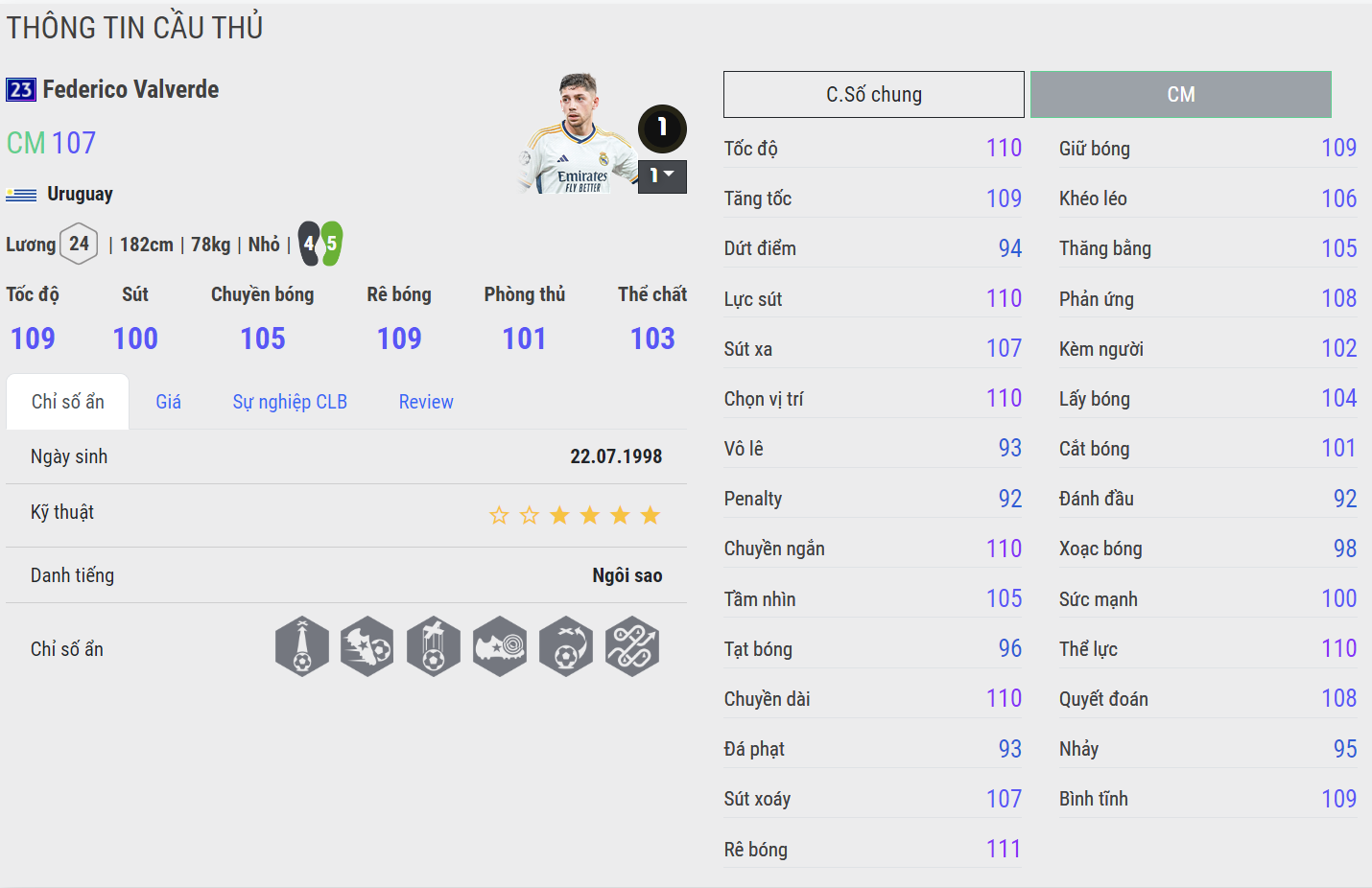 Để nói về một trong những cầu thủ đa năng bậc nhất FC Online thì không thể bỏ qua Valveder của Real Madrid, cầu thủ này đang cho thấy sự xuất sắc trong việc thi đấu ở nhiều vị trí khác nhau. Có thể thấy điểm nổi bật ở mùa thẻ 23UCL của Valveder chính là bộ chỉ số ẩn nhiều hơn và chú trọng hơn cho vị trí tiền vệ trung tâm ở khả năng chuyền bóng được nâng cấp rất nhiều. Tuy vậy Valveder vẫn được xem là cái tên cực kì đa năng trên hàng công.