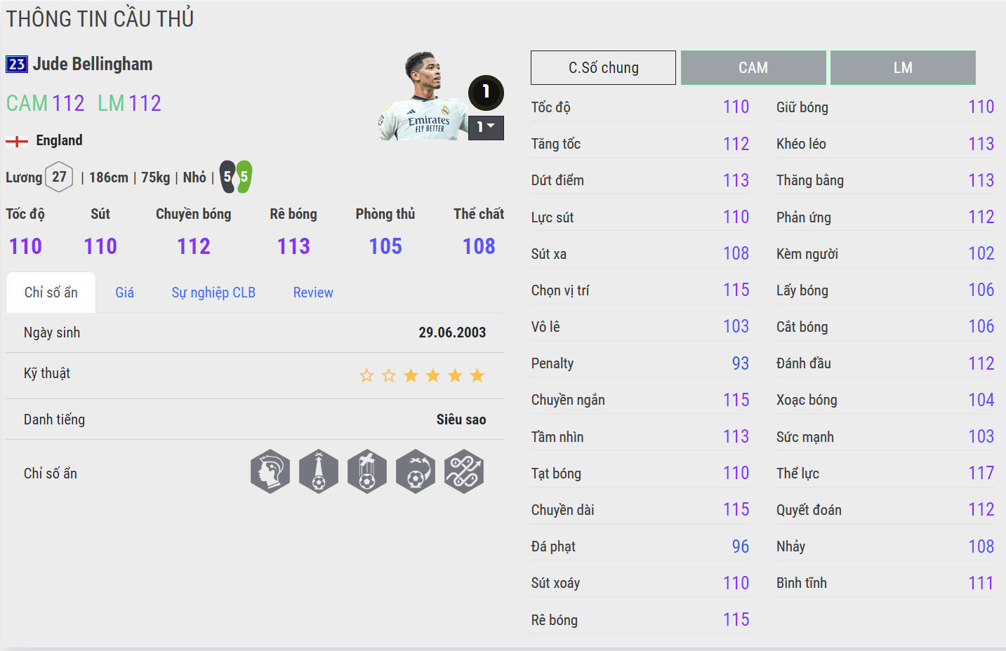 Tài năng sáng giá nhất Real Madrid thời điểm hiện tại chính là Bellingham. Tiền vệ người Anh hiện đang cho thấy giá trị sử dụng cực kì cao ở vị trí trung tâm từ tiền vệ công, tiền vệ trung tâm cho đến tiền vệ trụ. Phiên bản 23UCL được đánh giá như một phiên bản thu nhỏ của 24TY với bộ chỉ số thấp, dễ tiếp cận hơn và có tiềm năng không thua kém gì mùa TOTY hiện tại vốn đang làm mưa làm gió trong rank xếp hạng 1vs1.