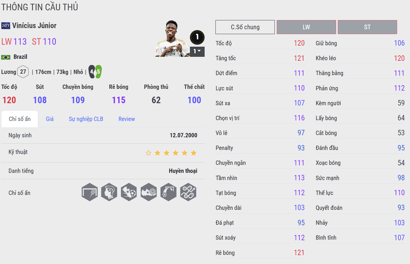 Vinicius là một trong những tiền đạo cánh hiệu quả của team color Real Madrid. Sở hữu tốc độ tốt, kỹ năng xâm nhập vòng cấm cực kì chủ động và điểm mạnh của Vini chính là AI di chuyển huyền thoại giúp anh nổi bật hơn rất nhiều so với những cái tên chạy cánh đương đại khác. Rê dắt tốt, dứt điểm hay cùng bộ kỹ năng chuyền hiệu quả khiến cho Vinicius được đánh giá rất cao.
