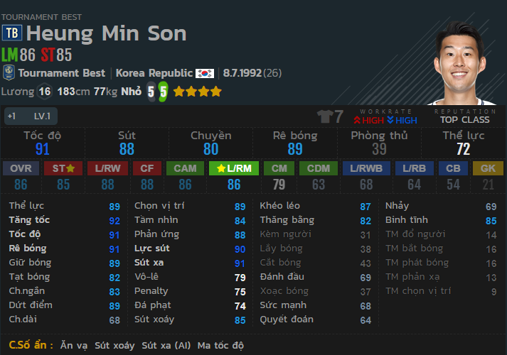 Son Heung Min TT có tốc độ tốt, sức mạnh ổn và khả năng sút 2 chân rất tốt.
