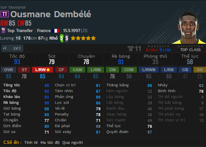 Với chiều cao 1m78 nhưng Dembele lại khá linh hoạt và thanh thoát. Mức lương ở mức 15 và giá trên thị trường chuyển nhượng là khá rẻ, nhìn chung là ổn cho một vị trí tấn công. Tuy nhiên với sức mạnh 49, Dembele hơi yếu trong tranh chấp và khiến nhiều người chơi cảm thấy không thích khi sử dụng.