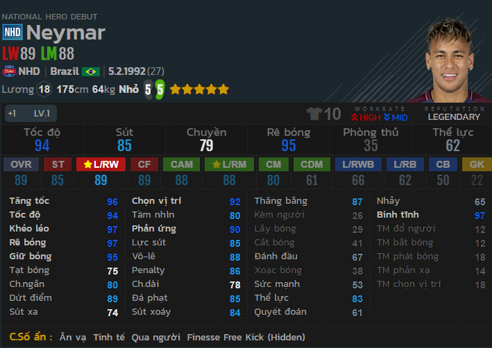 Một trong những tiền đạo nổi tiếng và tài năng bậc nhất. Được sử dụng khá rộng rãi bởi các game thủ Hàn quốc. Neymar là mẫu tiền đạo cánh tiêu chuẩn bởi tốc độ 94, bứt tốc 96 và có cảm giác việc tăng tốc vận hành rất trơn tru và ổn định . Khả năng rê dắt bóng là cực kì mượt mà có thể làm khốn đốn mọi cầu thủ theo kèm.