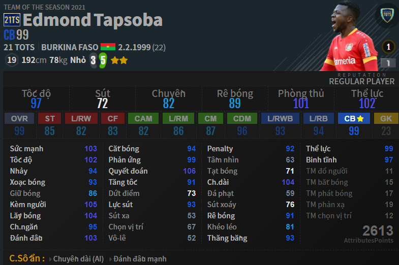 Chắc không nhiều người biết đến cái tên này, tuy nhiên anh đã có một mùa giải thành công. Tapsoba đã cho thấy tầm quan trọng của mình ở hàng thủ trong suốt mùa giải vừa qua với Leverkusen. Chiều cao 1m92 thực sự là một điểm cộng rất lớn với gameplay hiện nay.
