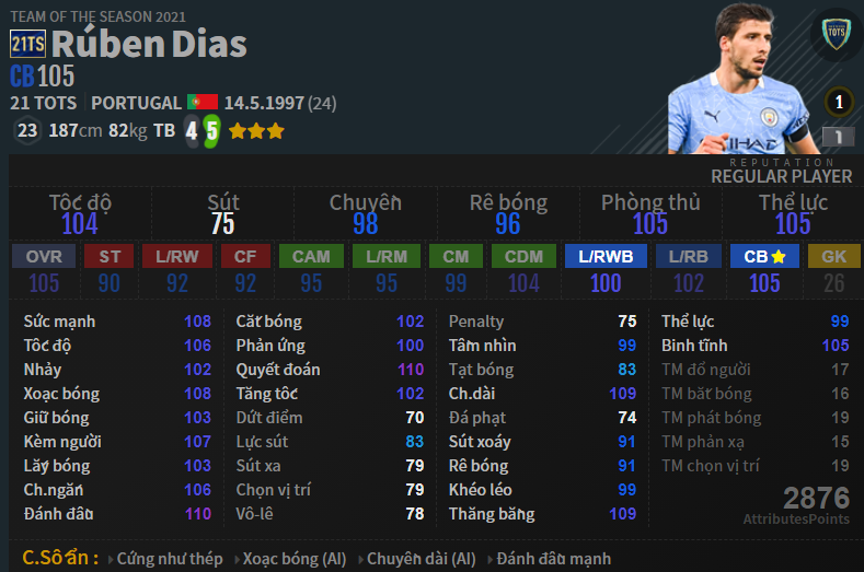 Hậu vệ người Bồ Đào Nha là cầu thủ hay nhất ngoại hạng Anh mùa vừa rồi. Và chắc chắn đây sẽ là một cái tên mạnh mẽ nhất trong tương lai, chiều cao, cân nặng và sức mạnh đều không còn gì để chê cả