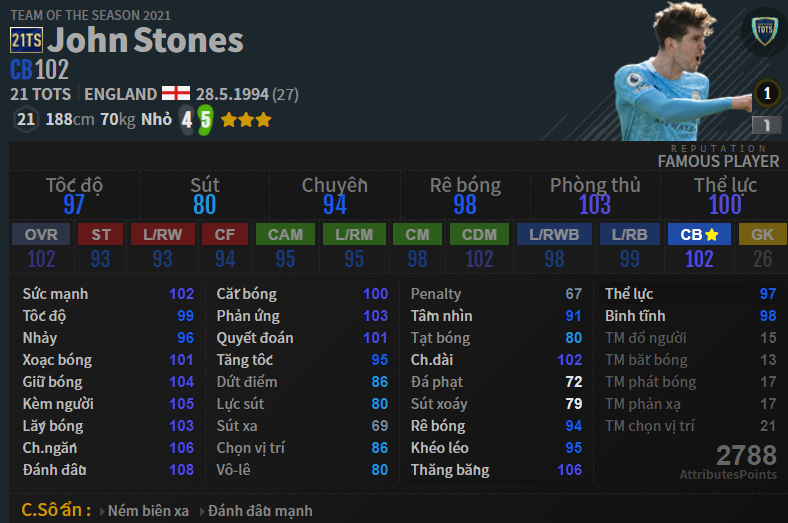 Hậu vệ người Anh cùng với MC vô địch ngoại hạng Anh, kết hợp hoàn hảo với Dias trong chuỗi thành công của MC mùa vừa qua. Sở hữu chiều cao lý tưởng, tuy nhiên khá mỏng cơm. Stones là mẫu cầu thủ thiên về cắt bóng và đọc tình huống nhiều hơn là sức mạnh. Khi mà khả năng xâm nhập của tiền đạo tốt hơn thì bạn sẽ cần những cầu thủ như Stones