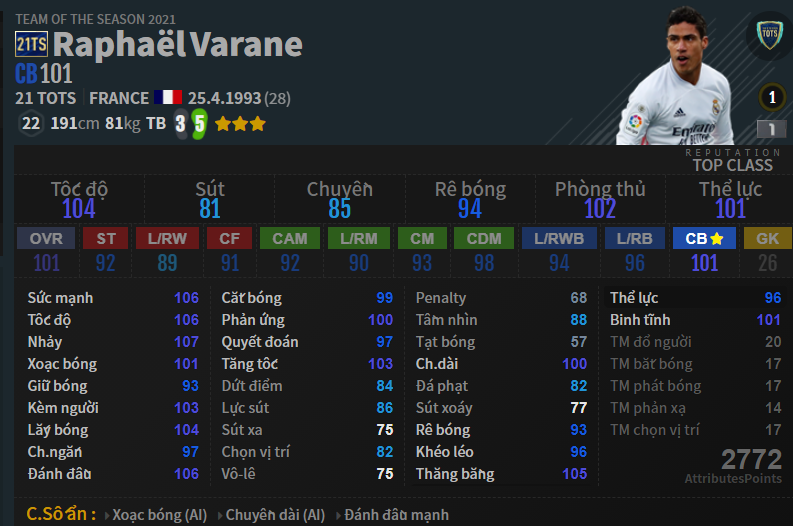 Vẫn là cái tên quen thuộc, mùa 20TS, LH và giờ sẽ là 21TS. Mẫu trung vệ chả chê được gì ở Varane, khi mà chiều cao khủng, sải chân dài, cùng với những thống kê phòng ngự cực tốt.