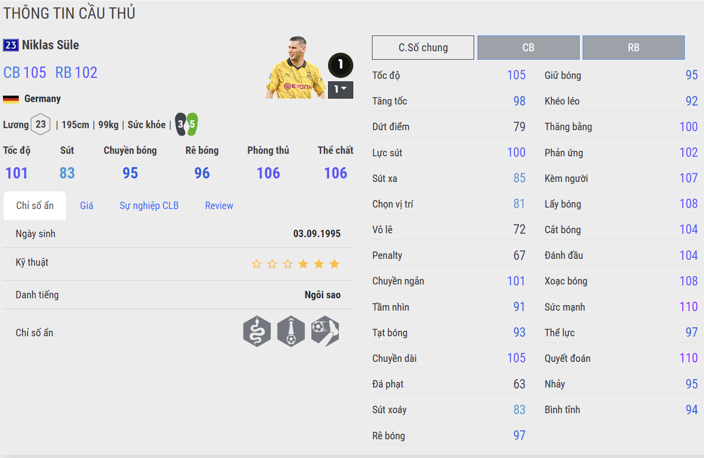 Trung vệ duy nhất có chỉ số ẩn siêu cản phá. Sule được xem là mẫu trung vệ cao to với thể hình và sức khỏe tốt cùng với sải chân dài khiến cho cầu thủ người Đức có khả năng tắc bóng rất ổn. Bộ chỉ số phòng ngự tốt cùng kỹ năng chuyền của Sule cùng được đánh giá cao. Điểm yếu duy nhất của Sule nằm ở tốc độ chưa thực sự nhanh vì vậy cần tùy thuộc vào người chơi sử dụng một cách hợp lý để tối ưu phong cách thi đấu của Sule.