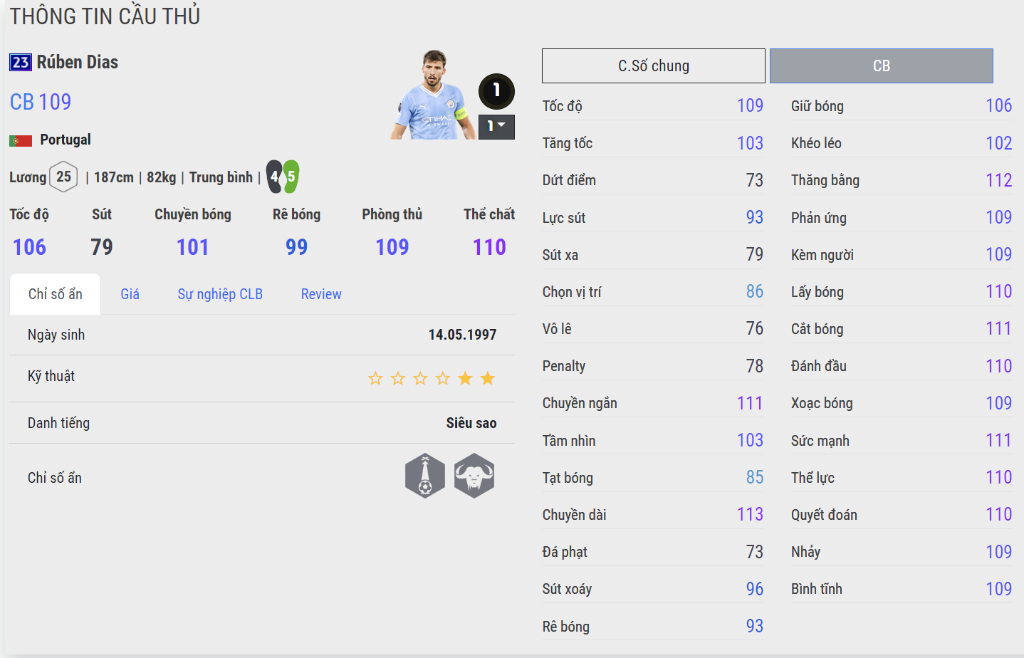 Trung vệ người Bồ được xem là chốt chặn đáng tin cậy của Man City thời điểm hiện tại. Kỹ năng chuyền bóng, khả năng đánh chặn, phòng ngự, không chiến của Dias đều rất ổn và phù hợp với phong cách chơi của meta hiện tại. Một điểm khiến Dias trở nên rất có tiềm năng chính là cơ hội đi sâu của Man City là rất cao với chất lượng đội hình tốt. Từ đó việc Dias có cơ hội gia tăng chỉ số cũng là rất tốt.