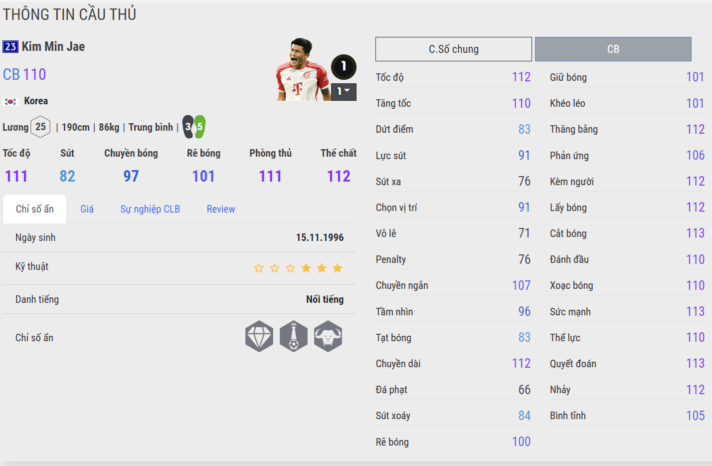 Kim Min Jae vốn là một trong những cái tên có giá trị sử dụng rất cao ở các mùa giải gần đây. Tốc độ tốt, thể hình cao to và một AI phòng ngự rất hay khiến cho trung vệ người Hàn được rất nhiều HLV tin dùng. Tuy nhiên với một số phiên bản gần đây có giá thành cao và khó tiếp cận thì một Kim Min Jae phiên bản 23UCL với giá trị sử dụng tốt sẽ dễ tiếp cận hơn nhiều đến game thủ FC Online.