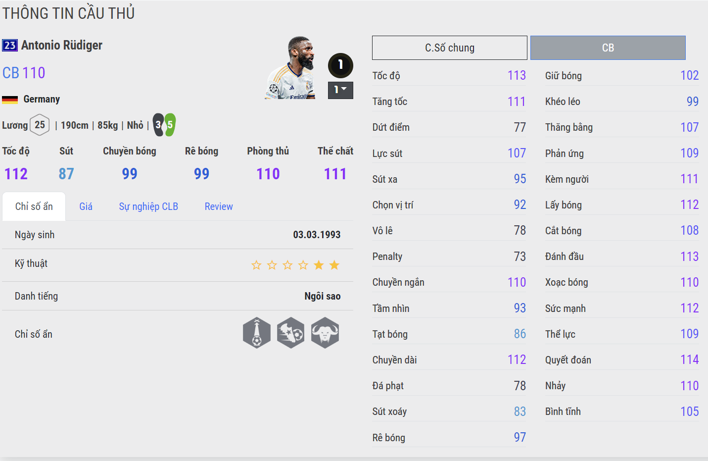 Mong chờ rất lâu cho một mùa giải có thể thay thế cho mùa SPL vốn đã bị ảo giá rất nhiều. Rudiger 23UCL còn cho thấy giá trị sử dụng cao với bộ chỉ số cực kì ổn cho vị trí trung vệ. Tốc độ tốt ,sở hữu ma tốc độ, khả năng tranh chấp, đánh chặn cho đến không chiến đều ổn. Không chỉ có vậy, Rudiger còn có cơ hội đi sâu vào C1 khi đang khoác áo một trong những đội bóng có thành tích tốt nhất tại đấu trường C1 - Real Madrid.